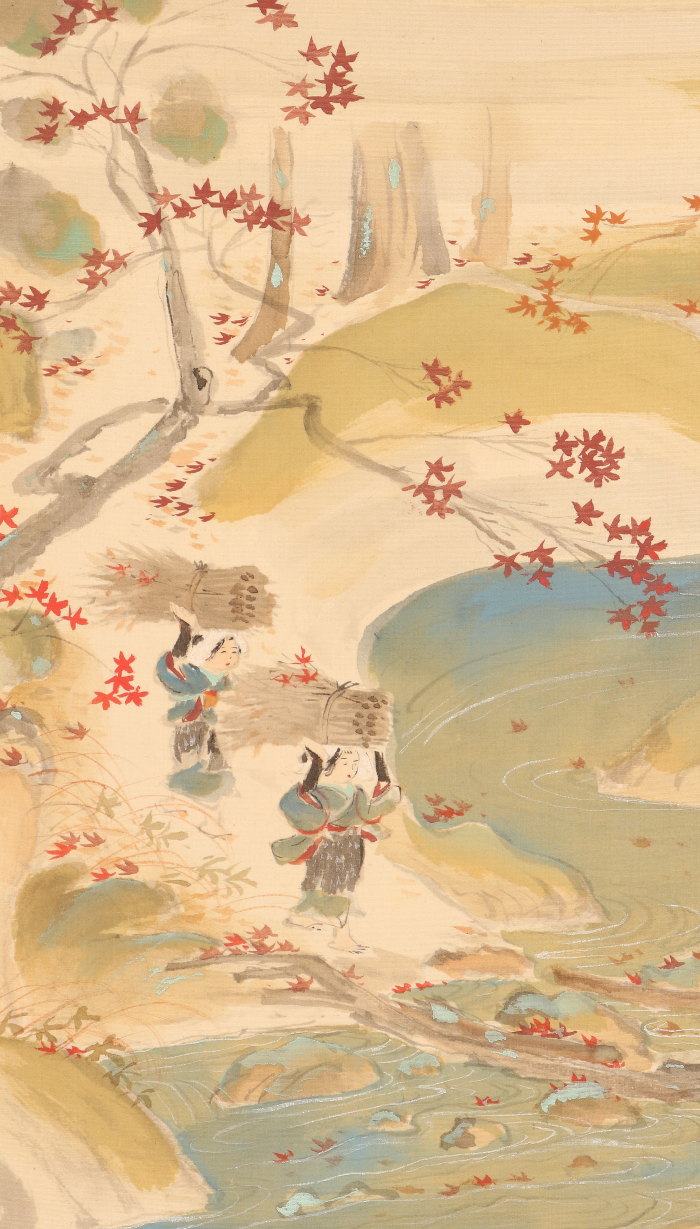掛軸<大河内夜江>紅葉山水図「洛北大原乃秋」大原女(HP1062)