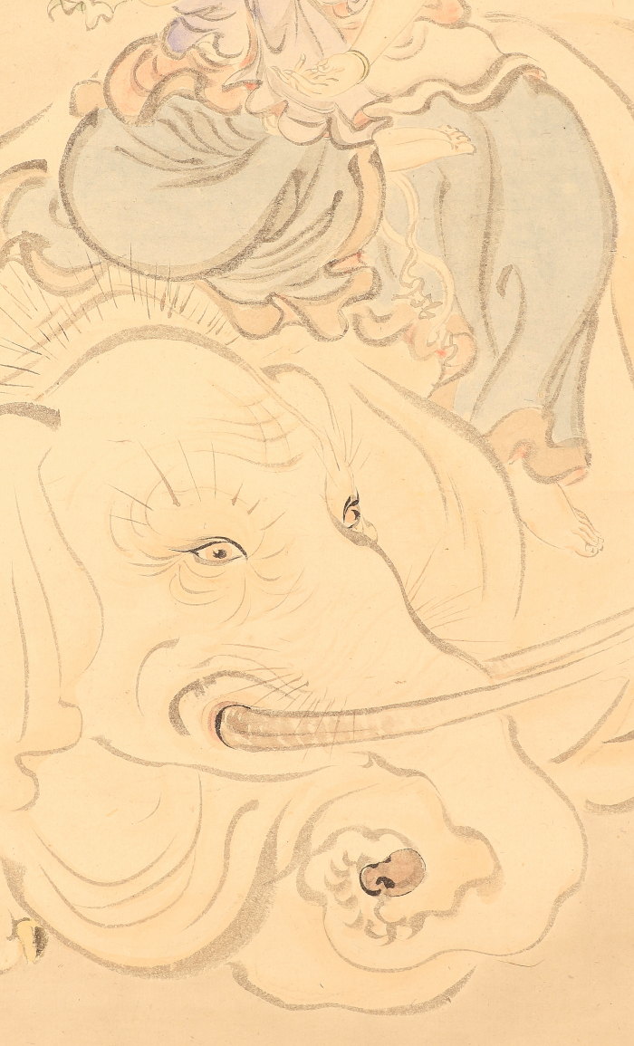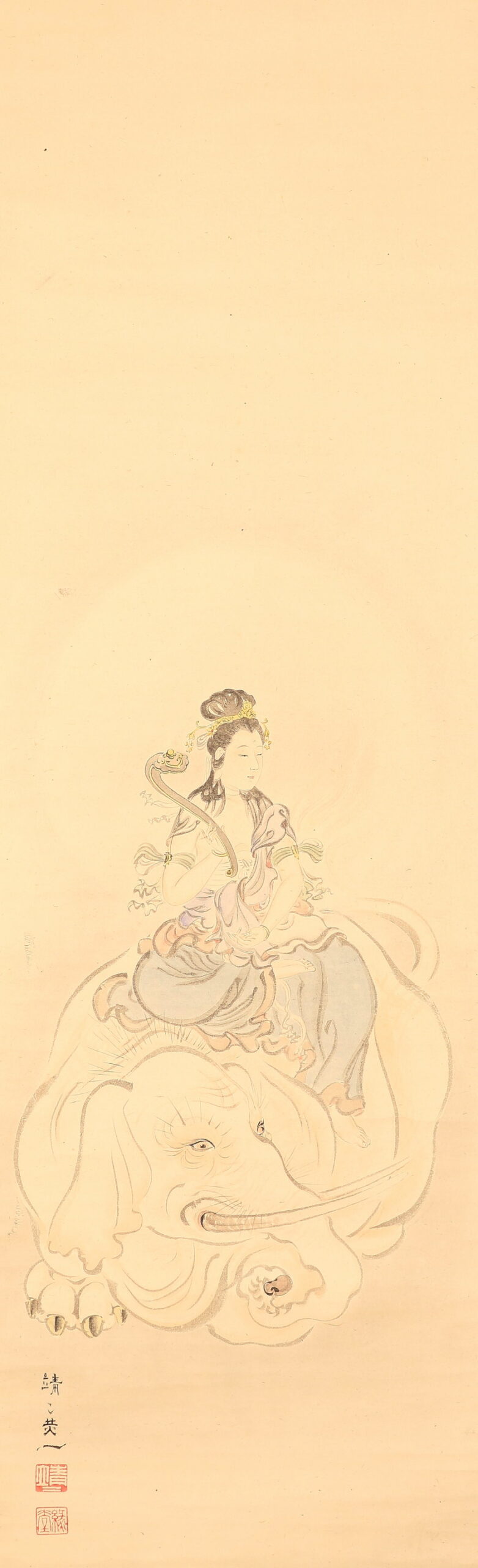 仏の悟り,瞑想,修行を象徴する菩薩。仏の教化や衆生済度をたすけるとされる。文殊菩薩とともに諸菩薩の上位にあって釈迦如来の右脇侍。白象にのった姿であらわされる。華厳経や法華経などに登場。東京国立博物館蔵の画像,大倉文化財団蔵の彫像が有名。