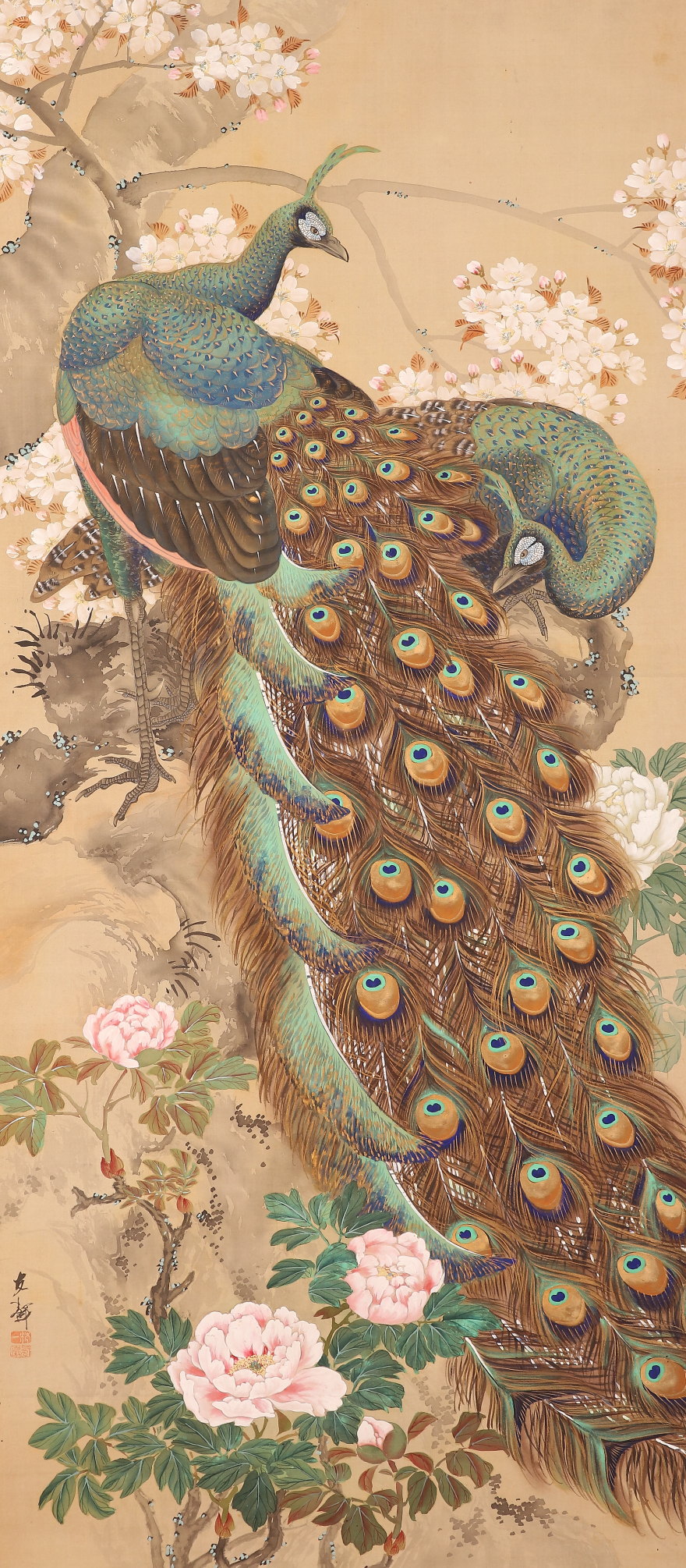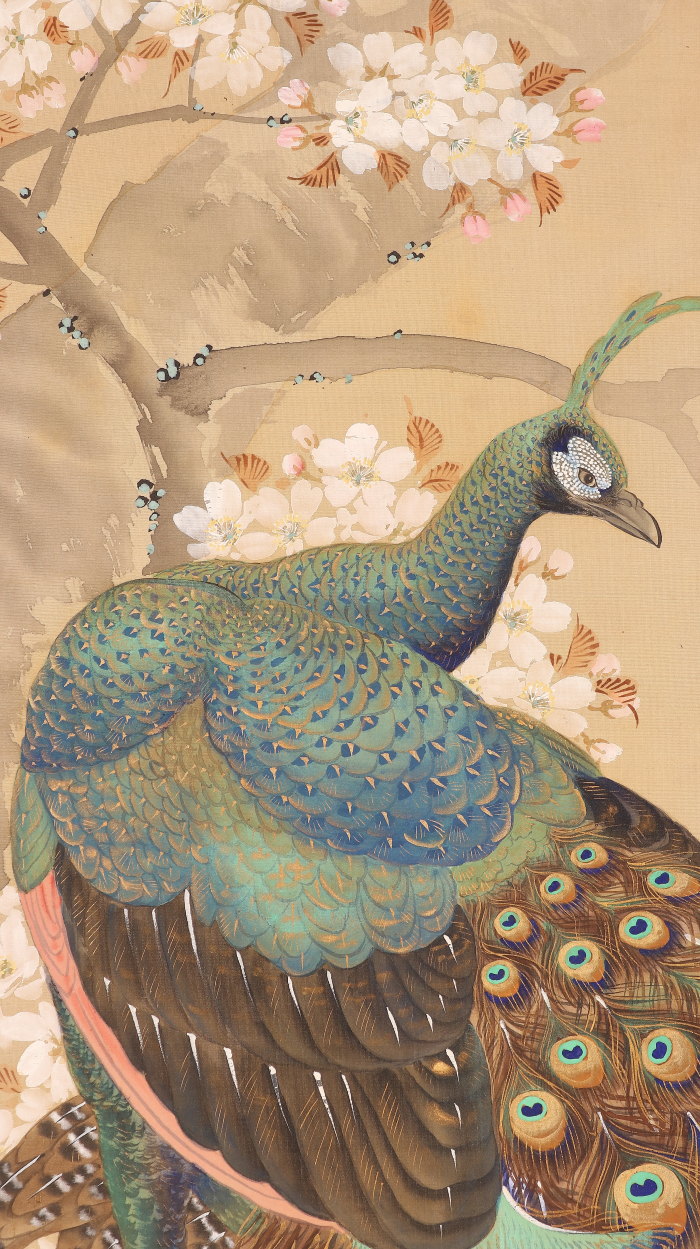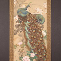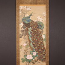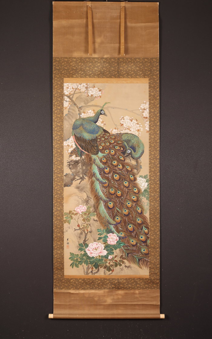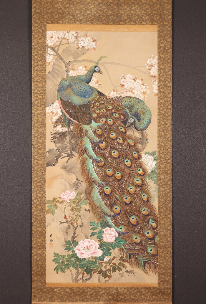 掛軸<堀江友声>桜牡丹に孔雀図(HP1347)