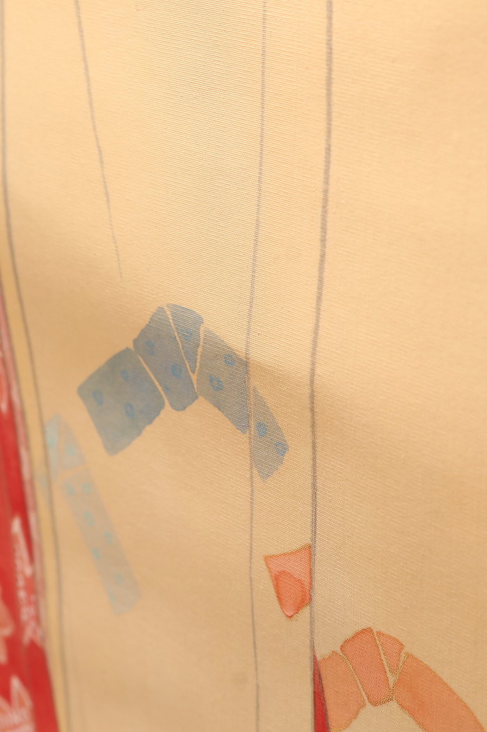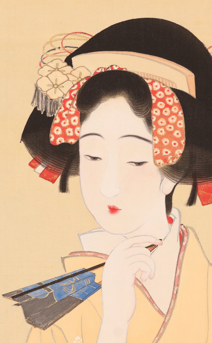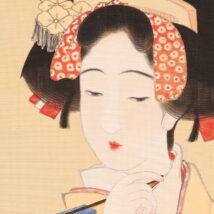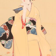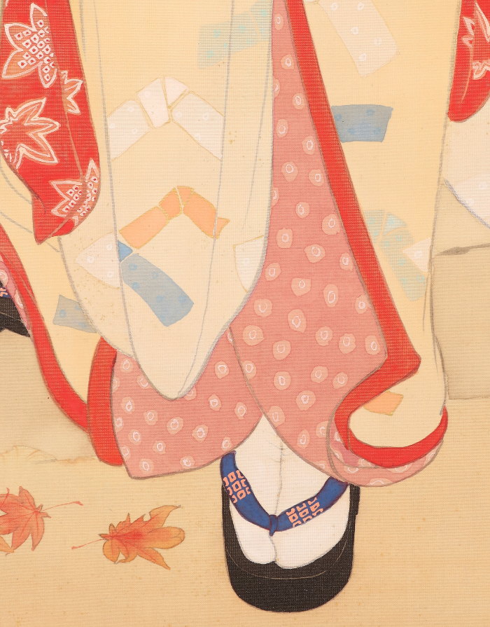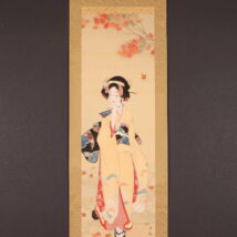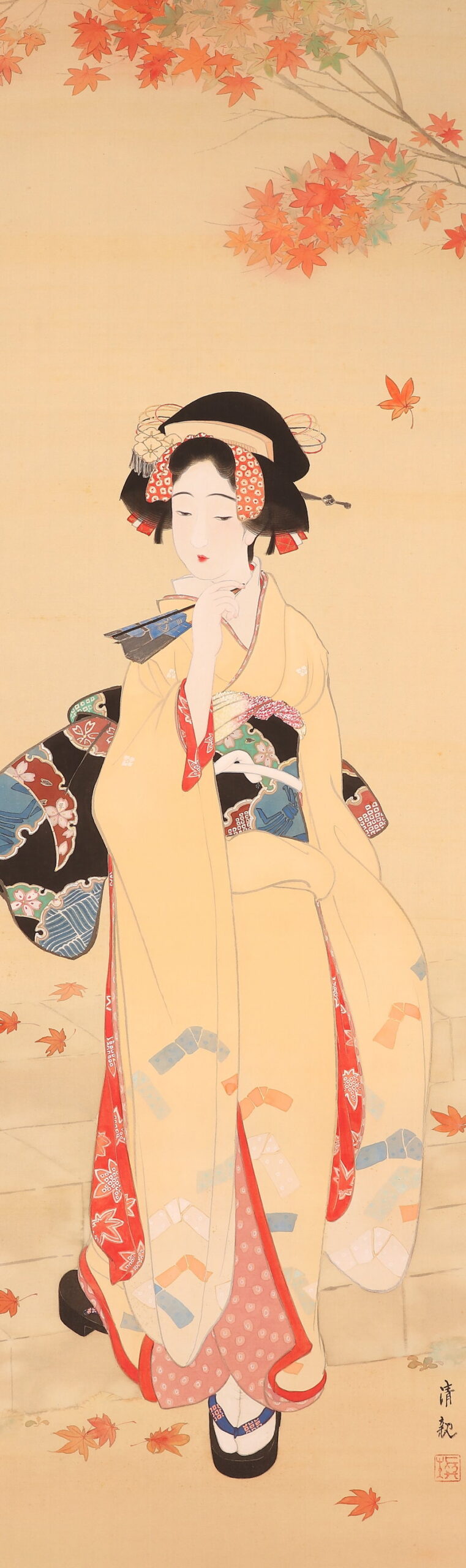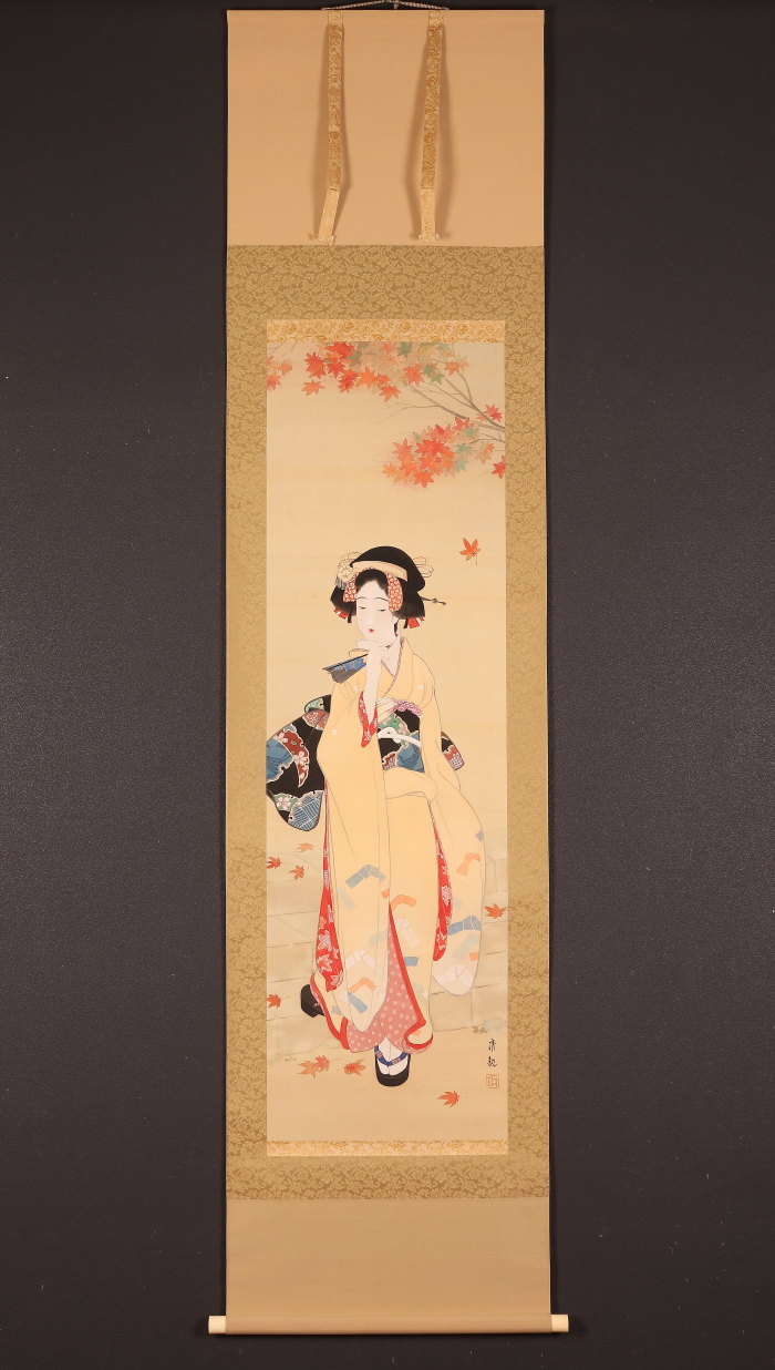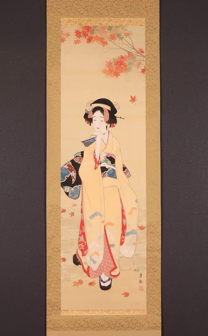 【売約済】掛軸<小林清親>紅葉に扇子美人図 「落葉」 秋掛(HP1389)