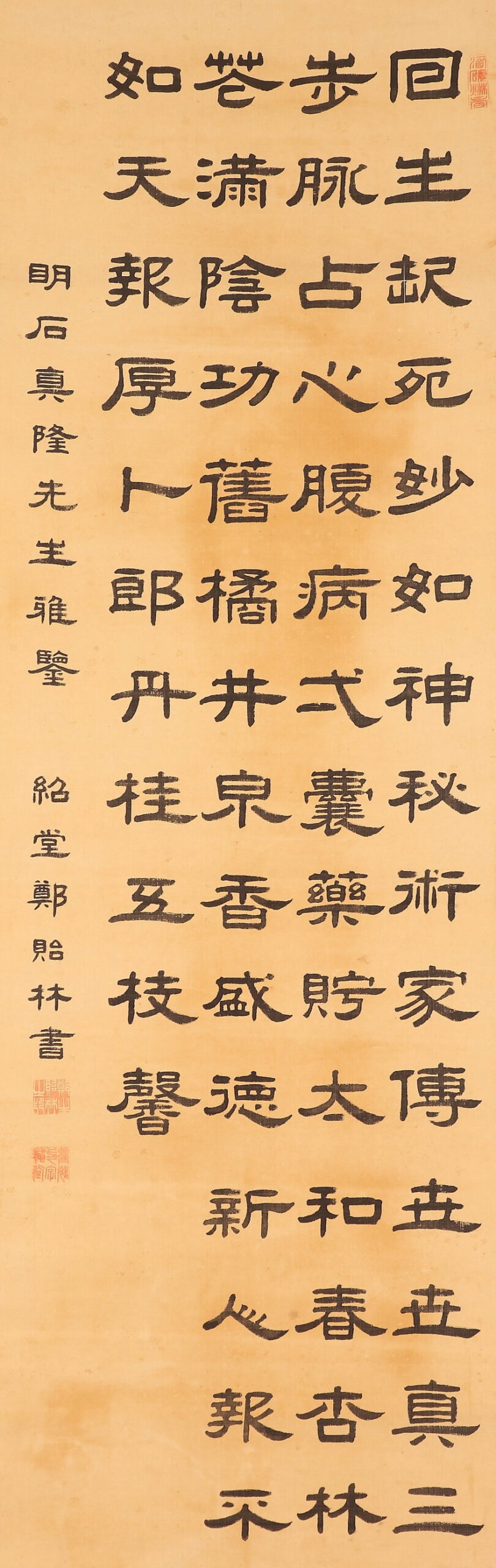 清国咸豊10年生まれ。字は登如、号は紹堂。研究は『書草堂』と署名している。書法と篆刻が得意で,隷書は特に有名。光緒年間に鹿港鎮(台湾彰化県)に渡航し、現地に定住した。台湾で碑文学校の数少ない書家の1人であり、当時の鄭鴻猷と共に清代の石工の名家、呂世宜の影響を受けた。