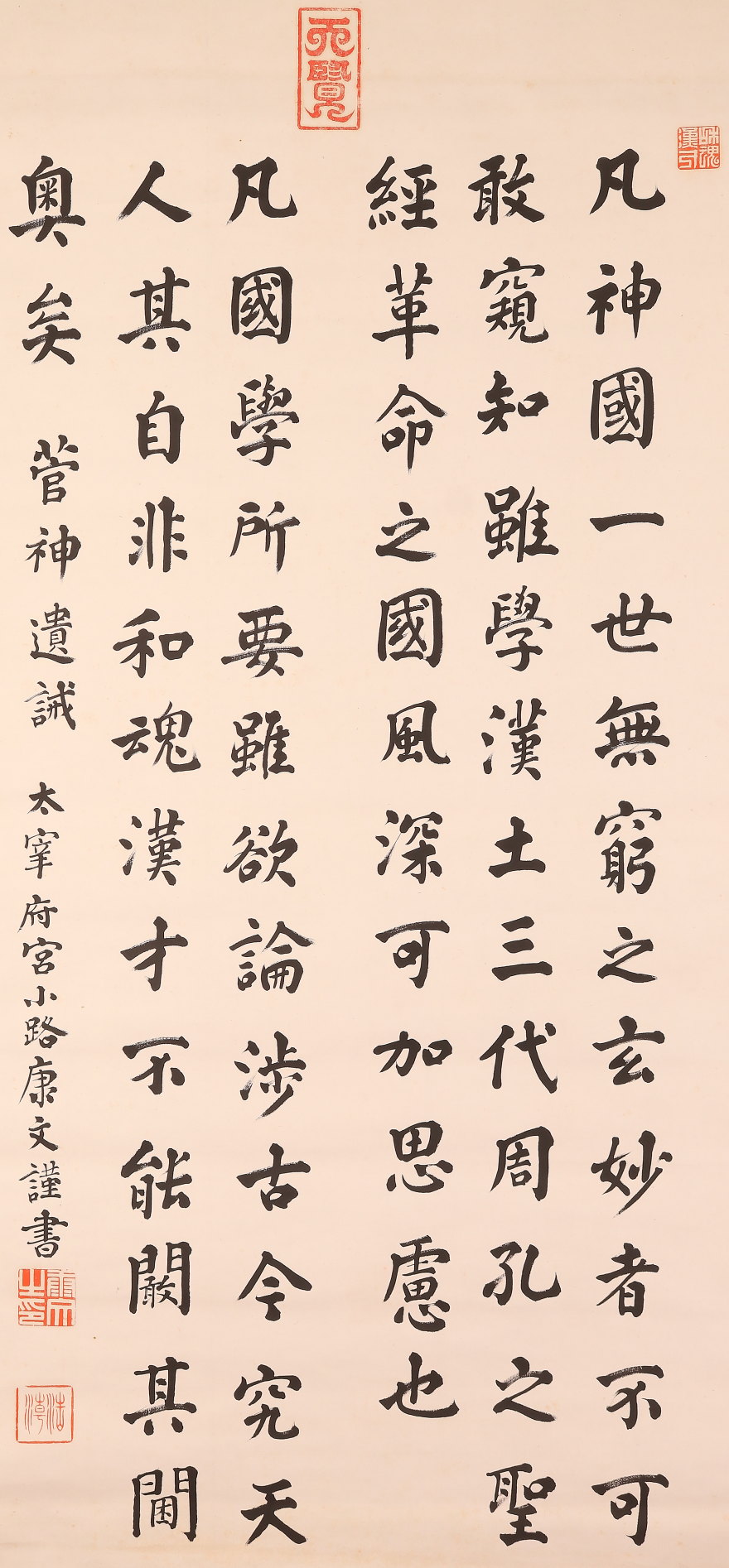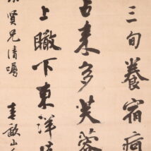 筑前の人。名は康文、号を浩潮・古梅などと称し、嘉永年間に比叡山で天台の学を修め、権大僧正となって帰郷し、太宰府で菅公廟の祭酒となり、大阿闍梨・大和尚に進むも還俗した人で、幼少より晋唐以来の諸名家や我が国の名筆を学び、特に空海の書法を究めた名筆家として知られた書家で、平安遷都1100年記念祭には特に下命に因って、平安神宮応天門の扁額を揮毫しているし、また明治28年に建碑された富岡神社の横綱力士碑の揮毫も行っている。
