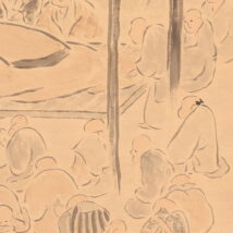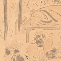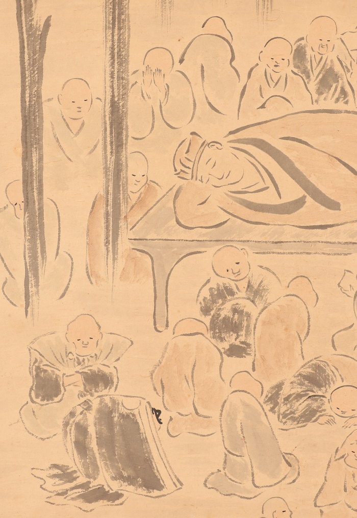 釈迦の涅槃すなわち入滅 (死) の情景を表わした図。双樹下の宝座に北を枕にし,右脇を下にして横臥する釈迦を取囲んで,菩薩,天部,弟子,大臣などのほか,鳥獣までが泣き悲しんでおり,樹上には飛雲に乗って,臨終にはせ参じようとする仏母摩耶夫人の一行が描かれているのが一般的な図様である。日本では平安時代以降,涅槃会の盛行に伴ってその本尊である涅槃図が制作され,なかでも高野山金剛峰寺の応徳3 (1086) 年銘のものが最古のすぐれた遺品。以後,鎌倉時代を中心に大小多数の遺品が残る。