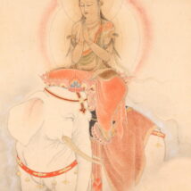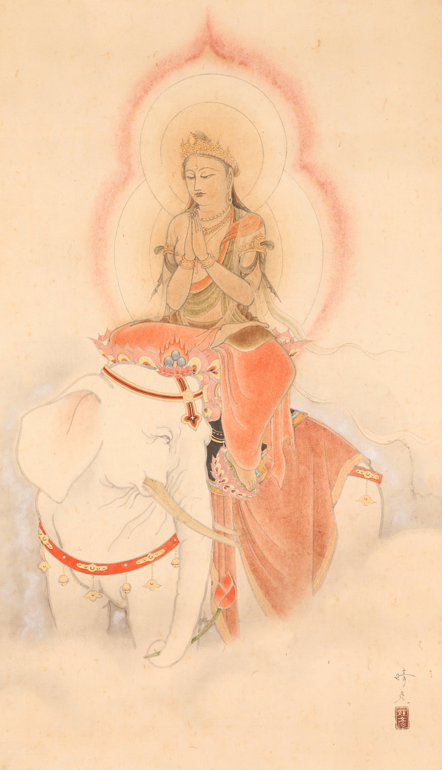 仏の悟り,瞑想,修行を象徴する菩薩。仏の教化や衆生済度をたすけるとされる。文殊菩薩とともに諸菩薩の上位にあって釈迦如来の右脇侍。白象にのった姿であらわされる。華厳経や法華経などに登場。東京国立博物館蔵の画像,大倉文化財団蔵の彫像が有名。