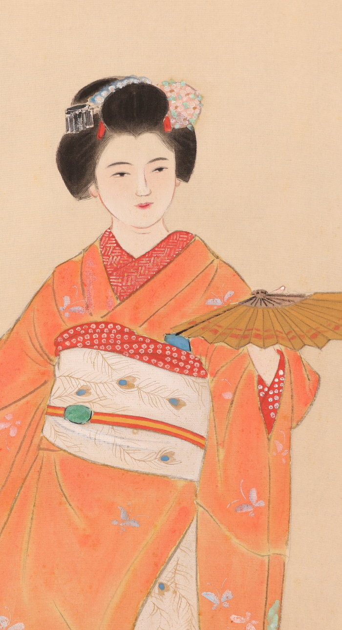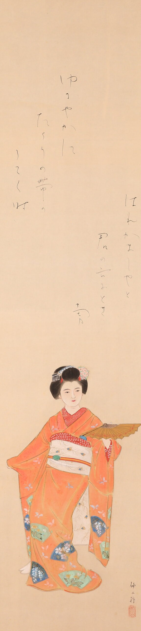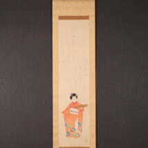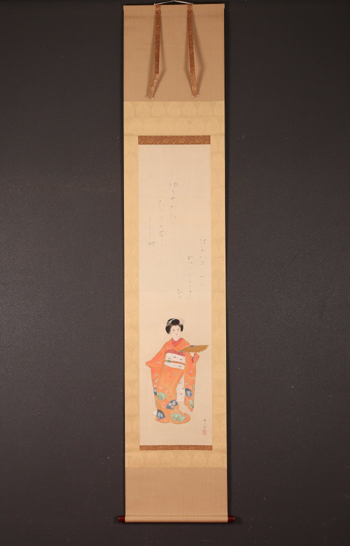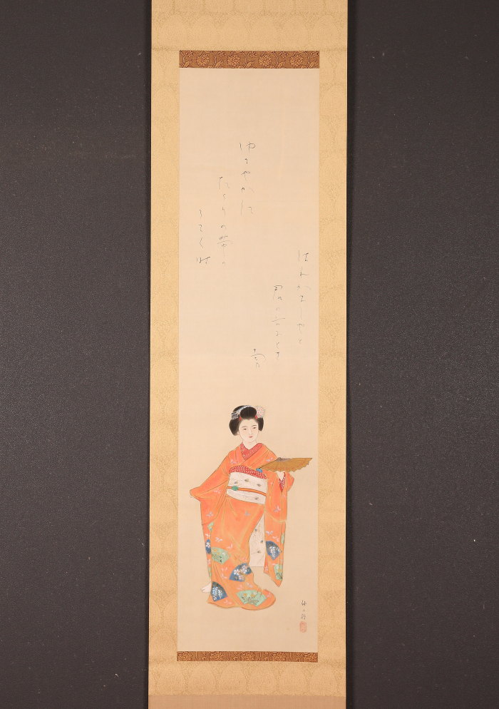 掛軸<粥川伸二 吉井勇>扇舞美人画賛(HP1509)