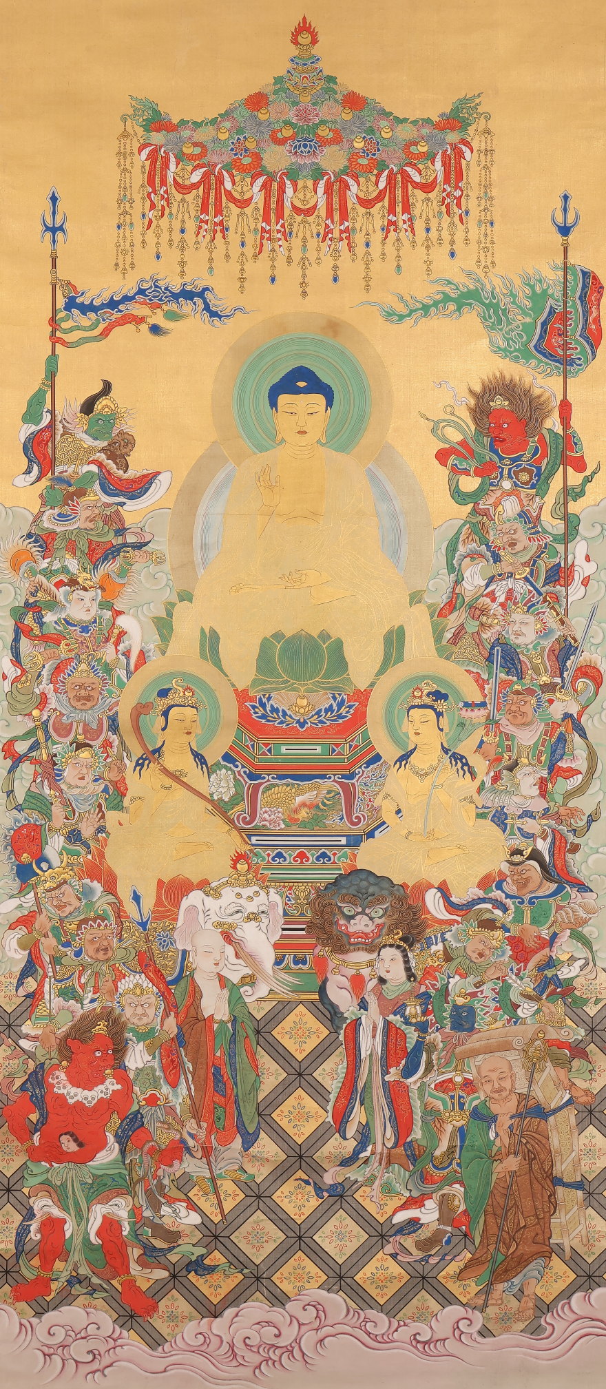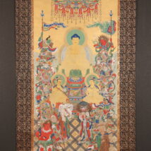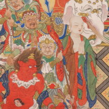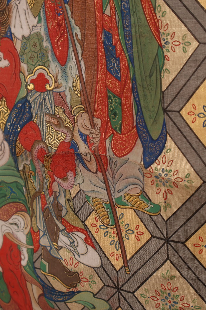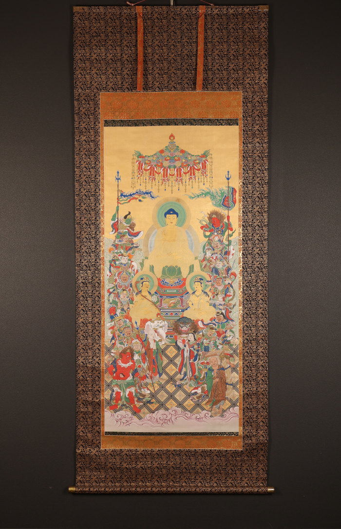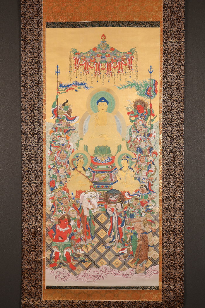 掛軸 大幅 仏画 釈迦三尊十六善神図 無落款 中国(HP1614)