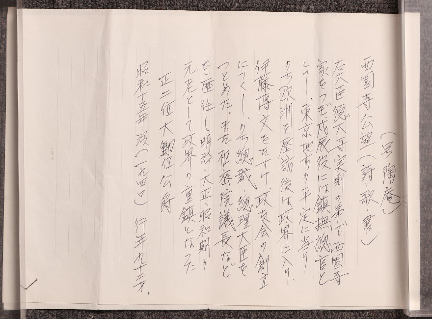 政治家・公爵。京都生。慶応3年王政復古に際し参与となり、鳥羽伏見の戦いに参戦する。クレマンソー・中江兆民と交わり、自由思想の洗礼を受けた。帰国して明治法律学校(明治大学)を設立し、枢密院議長を経て明治39年内閣を組織する。大正13年に松方正義が死去した後は、「最後の元老」として大正天皇、昭和天皇を輔弼、実質的な首相選定者として政界に大きな影響を与えた。また、教育にも尽力し、自らが創設した私塾立命館は現在の立命館大学の礎となった。