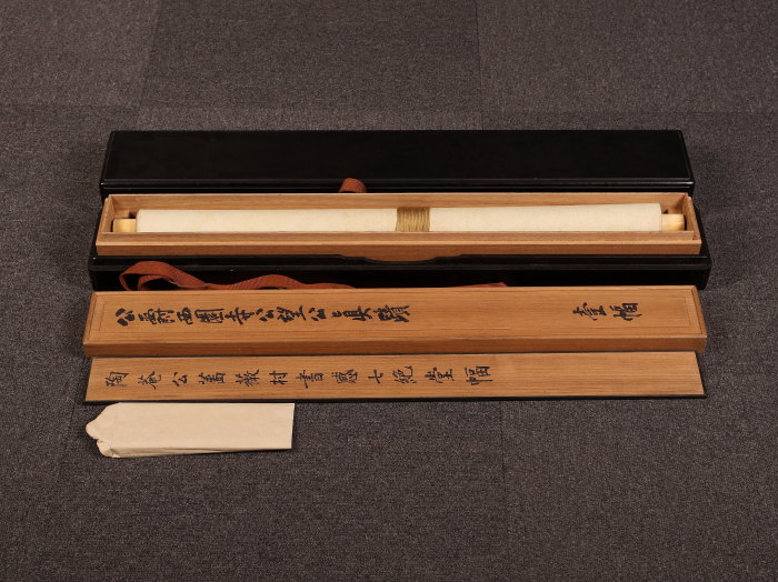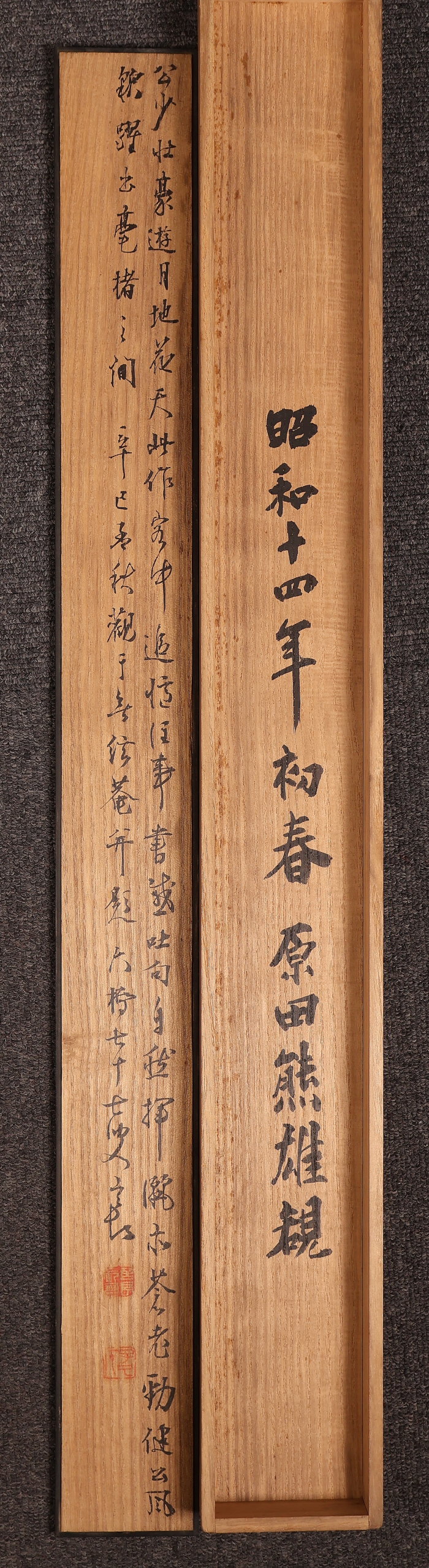 シミ、本紙に折れ、ヨレ、表具に少し虫食いがあります。 - 付属品極箱(原田熊雄)・極箱の蓋(杉渓六橋)・二重箱