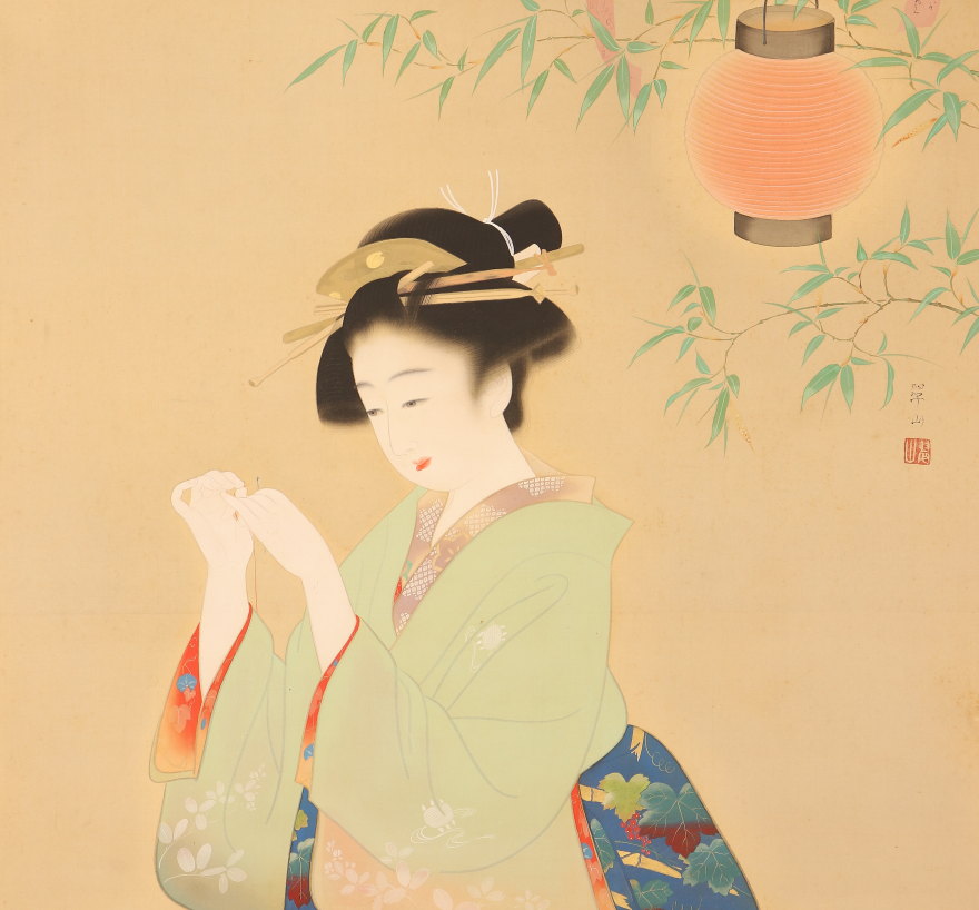 【売約済】掛軸<三木翠山>大幅 七夕裁縫美人図 堆朱軸先(HP641)